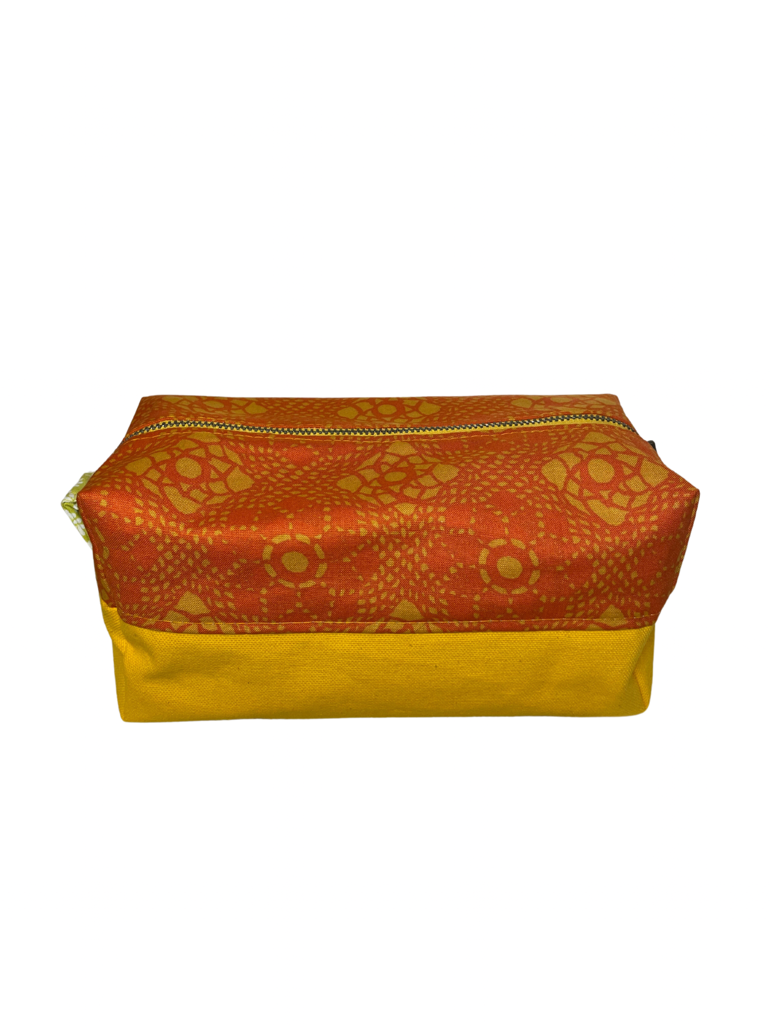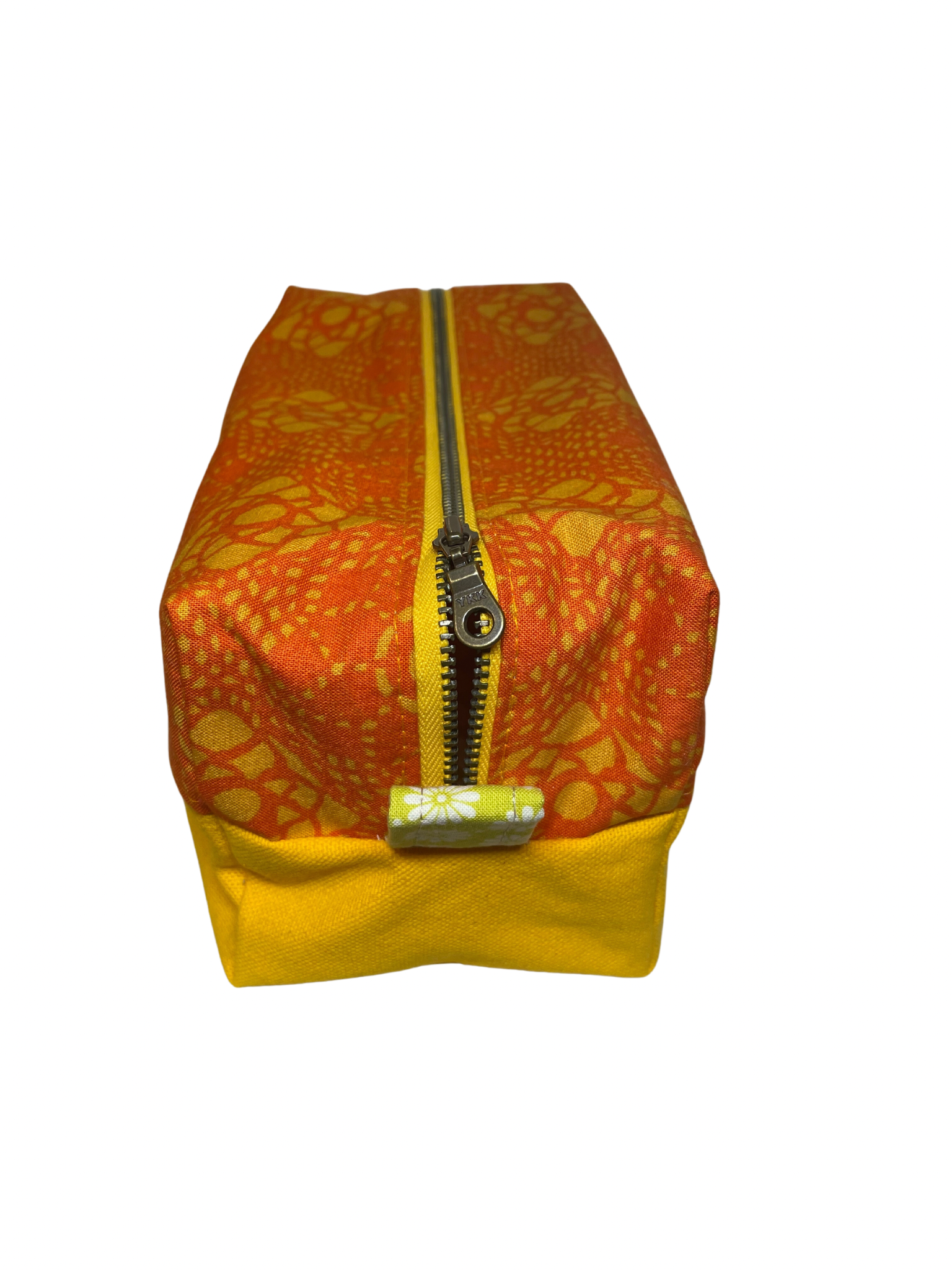 Nicely sized boxed pouch in an orange fabric with yellow lace-inspired accents designed by Alison Glass. A bright yellow canvas base with light interfacing. The lining is a retro yellow-green with dainty symmetrical daisies. Metal YKK zipper with small donut pull. Stitched with neutral thread. Slightly slouchy put maintains it's shape.